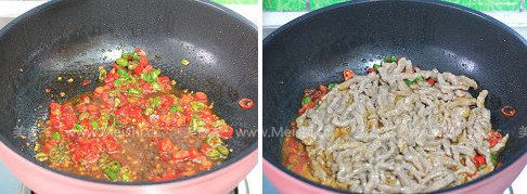 5.锅内留少许底油,煸炒葱、姜、蒜及尖椒、红椒、泡椒,加入豆瓣酱煸炒